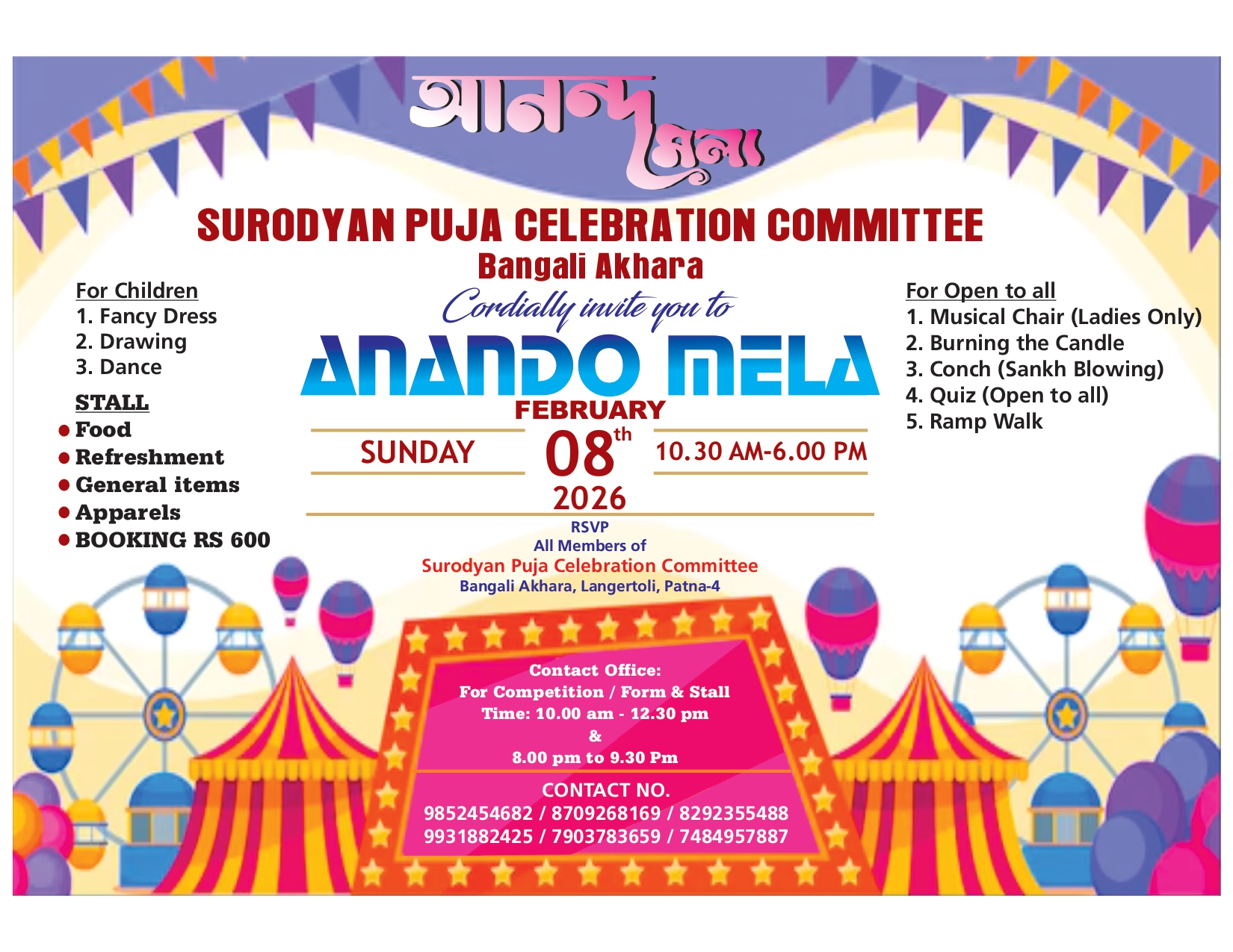 SURODYAN" better known by its name "BANGALI AKHRA" established in the year 1874 by Late Binod Behari Mazumdar with Some of his reliable friends Late Lal Belari Bose, Lale Devendra Nath Butte, Late Suresh Kabiraj la others to carry out mainly physical activity. They approched to late Sarab Kumar Sinha popularly known by as "TUN TUN BABU" with their ideas. He helped them by providing some area in his his bagicha to run the activity temporarily from there. with increasing number of member's day by day they felt to Start a full fledged "GIM" " and Started looking for a permanent land in the area for which they started mobilising fund forom eminent-bergalies.ultimetly they purchased the present land in the year 1895. started Running SURODYAN ATHEISTIC CL CLUB". Many freedom used to take physical traineghere which alerted the British administration to eye on the Club premises. Knowing this from. a reliable source of the then administration founder of the Club Late BINOD BEHARI Mazumdar to Start SAKTI PUJA as a cultural felt t part of Bengals "SHREE SHREE DURGA PUJA" in the year 1893. It is belived that this is the Oldest SARBOJONIN DURGA PUJA Of PATNA. Later on SARBOJONIN KALI PUJA, LAXMI PUJA, & SARAWATI PUJA started organising in the due course of time as felf." needed by the club. Beside this VIRASTAMI SHow" is held on ASTAMI TITHI OF DURGA PUJA by. our athletic weight limbers such as "Body Building" "Gymnastic & some motor cycle stunts. Emirent fatraties & Digretaries paid to be present and as huge local crowed used to be present to watch the show. On the vejoya Dasami day emirent Bhartiya Classical Music artists used to perform infront of "MAA DURGA" to Show their respect in seen her blessings. This sergebuJA is known as "BARI MAA OF BANKIPUR among the devotees of this area. The PUJA Comienities. The pujari's penes performed by all we wall of people s in Bengal's heritage retual called SORAS- UPACHAR": DRUMER'S from Bengal are arranged to play" DHAC" during this DURGA PUJA which is also admired by the devotees. On the MAHA ASTAMI DAY a girl aged betwven syrs to Maximum 10yrs is being worshiped as "KUMARI MAA DURGA" popularly known as "KUMARIPUT" aspor relual which is a agan special event among devotees to watch. In three day of "DURGA PUJA" huge entity of prased paccects consisting of fruit & sweets is distributed among devotees "Anna bhog Prasad" there's is also distribucted free among devotees. There system to offer PUJA in one's to also a nam & gotre by offeringa minimum donation.amount of rupees 350 to 450 "Anne Rehog Prased" arranged a earther pot called "MALSA" in appropriate contity which is a huge among Devotees. Lastly to on After BIJOYA ZASAMI PUJA is over, in the ever evening ladies in traditional outfit (Lal PAR SAREE) holding a thali considly of PAN, DUBISA, Sweets a In SINDOOR to for "VARAN" retual After that all ladies used to exchange their "SINDOOR" by way of putting in one another forehead (MANGS) EX SANICHA BANGELS in their hands and seeking blessings from their elder's (MAA, MASI) by towely their feet with a -good wishesh Sayang SUBHOBIJOYA".
